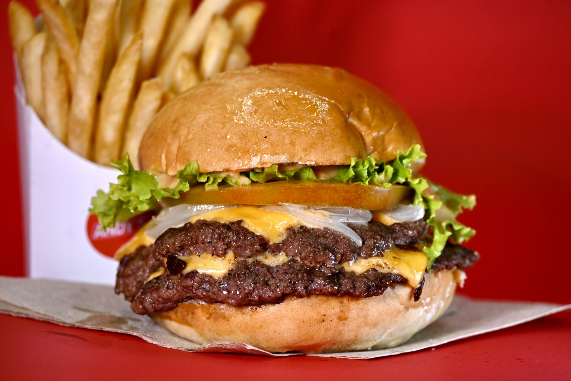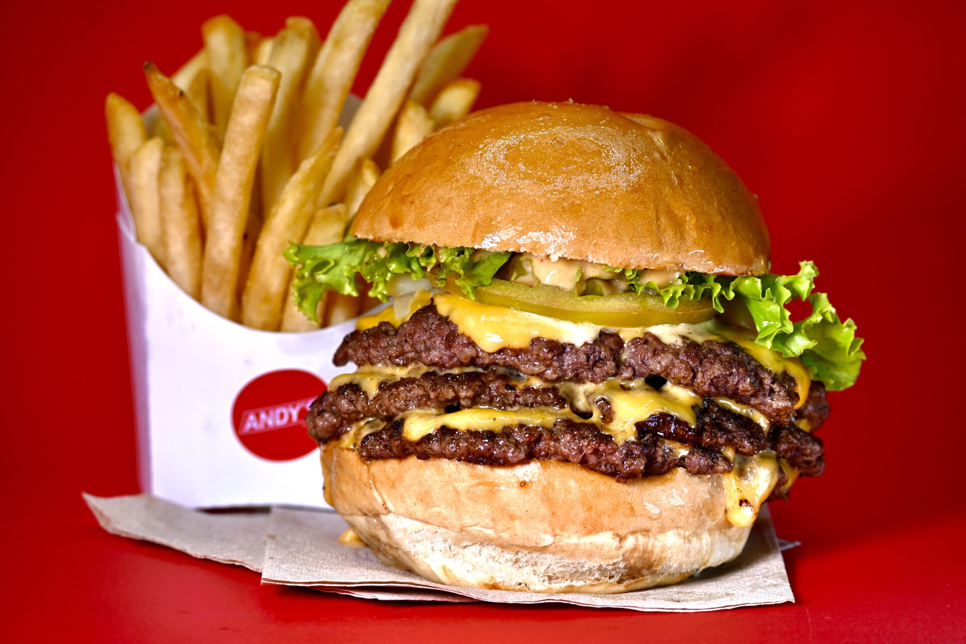 Dos carne de 3 onzas, queso, cebolla, lechuga, tomate y pepinillos. Incluye papas fritas y bebida 16 onzas.