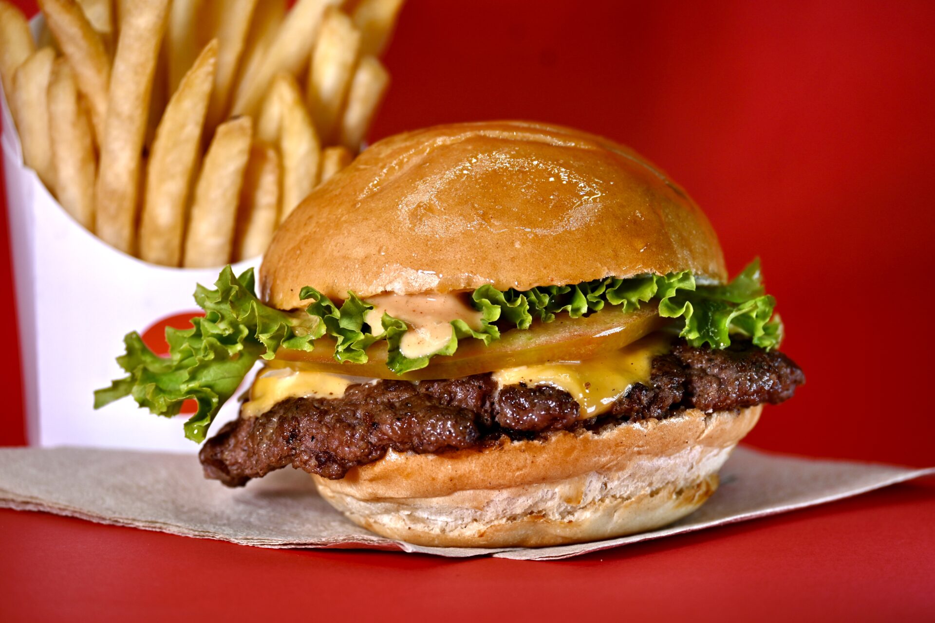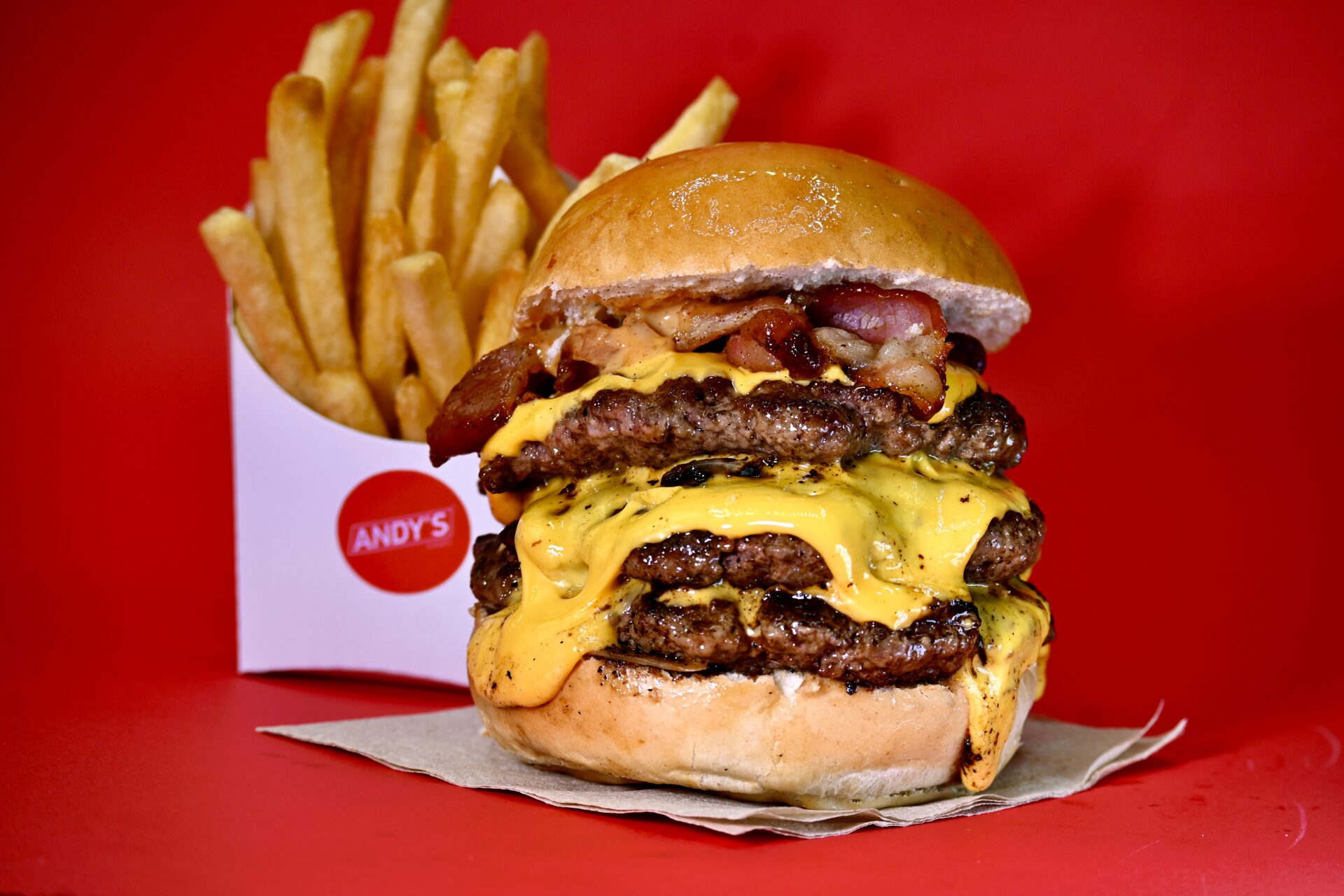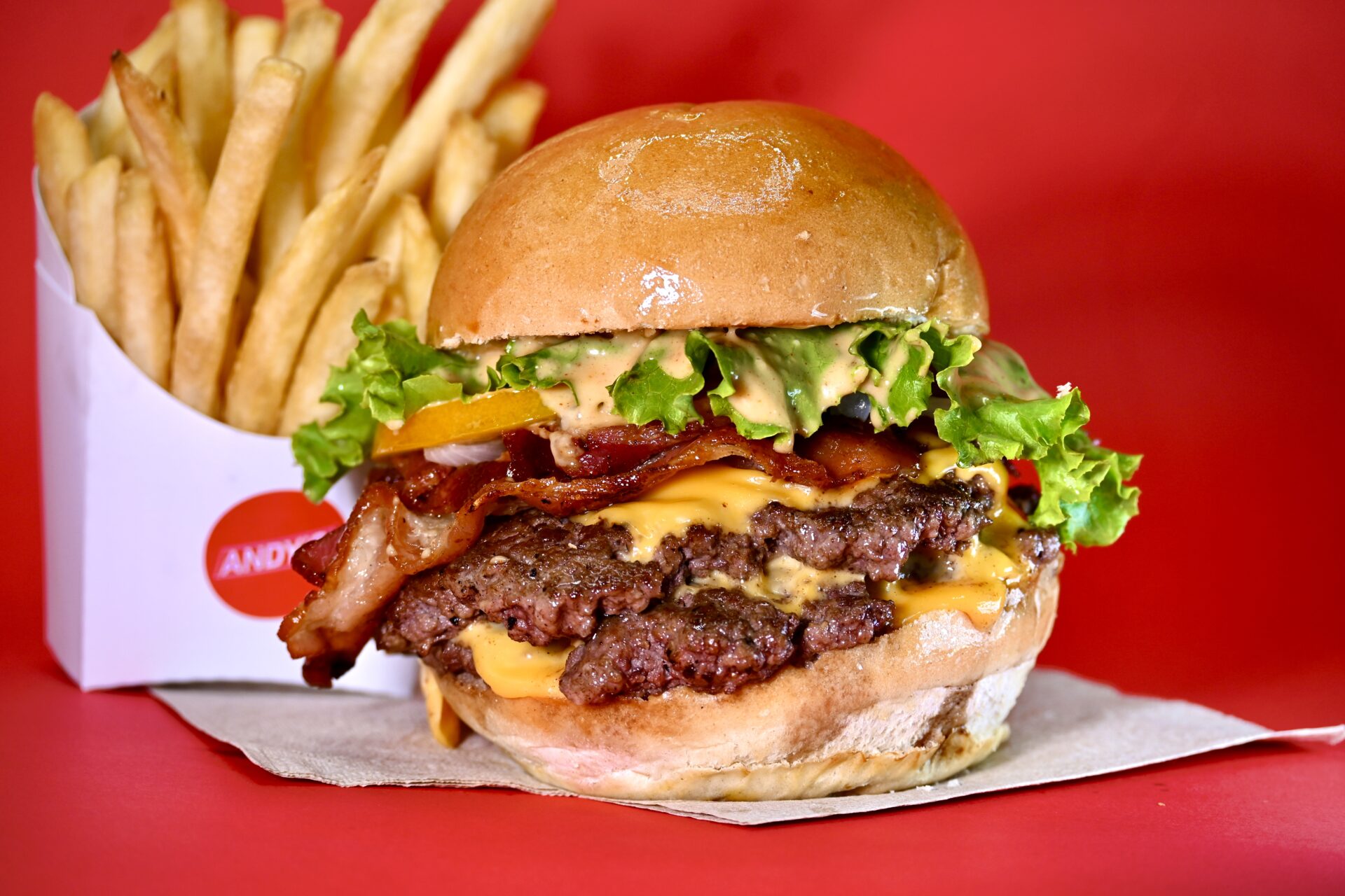 Dos carnes de 3 onzas , queso americano y dos capas de bac贸n. Incluye papas fritas y bebida 16 onzas.